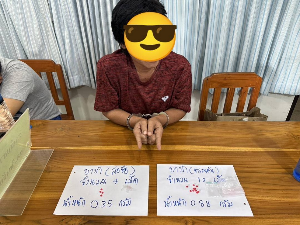 พร้อมด้วยของกลาง ลำดับที่1. ยาบ้าหรือเมทแอมเฟตามีนลักษณะเม็ดกลมแบนสีแดงประทับอักษร WY ด้านเดียวจำนวนรวม 4 เม็ด น้ำหนักยาบ้ารวมประมาณ0.35 กรัม (ล่อซื้อ)