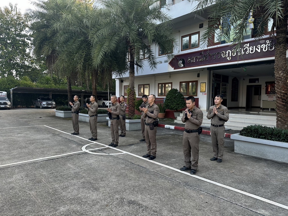 วันที่ 11 พฤศจิกายน 2567 เวลา 07.30 พ.ต.อ.กฤษฎา งามจิตต์ ผกก.สภ.เวียงชัยฯ,พ.ต.ท.วรเทพ คำดี รอง ผกก.ป. สภ.เวียงชัยฯ,พ.ต.ท.แดน ใจหาญ สวป.สภ.เวียงชัยฯ มอบหมายให้ ร.ต.อ.วุฒิชัย ชัยยะรอง. สวป.ฯ ร้อยเวรป้องกันปราบปราม(ร้อยเวร20)ผลัดเวลา เวลา 08.00 น.-เวลา 20.00 น. เรียกแถวสายตรวจรถยนต์-รถจักรยานยนต์ ตรวจจำนวน ประชุมชี้แจง กำชับการปฎิบัติหน้าที่ ดังนี้ - ตรวจเครื่องแต่งกาย ทรงผมถูกต้องตามระเบียบ มีอุปกรณ์ในการปฏิบัติ เช่น อาวุธปืน กล้องประจำตัว กุญแจมือ ไฟฉาย และ รองเท้า เรียบร้อยดี - กำชับออกตรวจเยี่ยมพบปะประชาชน ใช้กิริยาวาจาสุภาพ อ่อนโยน - ให้ออกตรวจจุดเสี่ยง-จุดล่อแหลม สถานที่สำคัญ สถานที่ราชการ และตู้แดง ในเขตพื้นที่รับผิดชอบเพื่อป้องกันเหตุและรักษาความสงบเรียบร้อยของประชาชนอย่างเคร่งครัด - ให้ปฎิบัติหน้าที่ด้วยความไม่ประมาท - ให้ใช้หลักกฎหมายหลักยุทธวิธีของตำรวจในการปฏิบัติหน้าที่พร้อมด้วยการใช้อุปกรณ์ เช่น กระบองในการระงับเหตุ ห้ามมิให้เกี่ยวข้องกับยาเสพติดฯการพนันและเรียกรับผลประโยชน์โดยมิชอบด้วยกฎหมาย -ให้กวดขันกลุ่มวัยรุ่นแข่งรถในทางสาธารณะและคนต่างด้าวเข้าเมืองฯ - ให้ปฎิบัติตามมาตราการป้องกันโรคติดต่อไวรัสโควิด-19 - ตรวจอาวุธปืนทางราชการไม่มีการเบิก -ให้กวดขันเกี่ยวกับความประพฤติและระเบียบวินัยของข้าราชการตำรวจ ดังนี้ 1 การแสดงความเคารพระหว่างผู้ใหญ่และผู้น้อย 2 การแต่งเครื่องแบบ 3 การพกพาอาวุธปืน 4 การวางตัวในการปฏิบัติหน้าที่ต่อประชาชน 5 การให้บริการแก่ประชาชนในหน้าที่ของตำรวจ 6 การปฏิบัติหน้าที่โดยสุจริต 7 ความสามัคคี 8 การรับฟังความต้องการ และปัญหาการปฏิบัติงานของผู้ใต้บังคับบัญชา